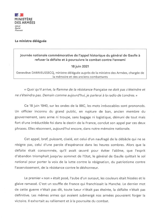Message officiel de Madame Geneviève Darrieussecq ministre déléguée auprès de la ministre des Armées, chargée de la mémoire et des anciens combattants, à l’occasion de la journée nationale commémorative de l’appel historique du 18 juin 1940 du général de Gaulle.