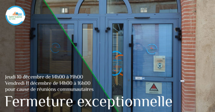 L’accueil de la mairie sera exceptionnellement fermé : Jeudi 10 décembre de 14h00 à 19h00 Vendredi 11 décembre de 14h00 à 16h00 pour cause de réunions communautaires.